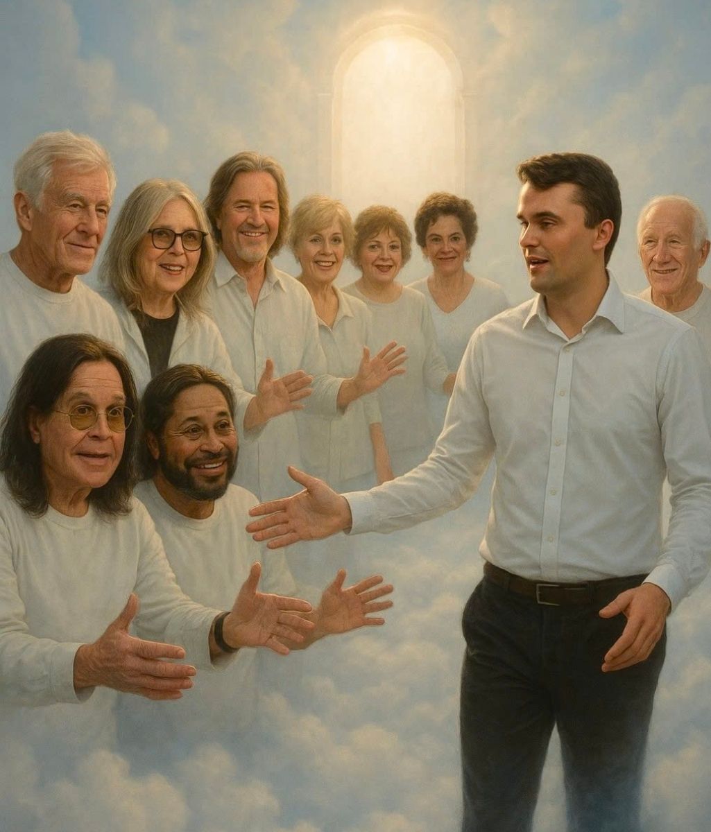 Standing beneath a sky that glows with the light of eternity are the faces that shaped America’s heart and culture — Robert Redford, Diane Keaton, Val Kilmer, Ozzy Osbourne, Leslie Charleson, Malcolm-Jamal Warner, Connie Francis, and Bob Uecker — legends whose earthly journeys have come to rest in the same eternal home. And now, they are joined by one of the youngest among them: Charlie Kirk, the passionate voice of conviction and courage whose life was cut short in September 2025 at the age of 31.