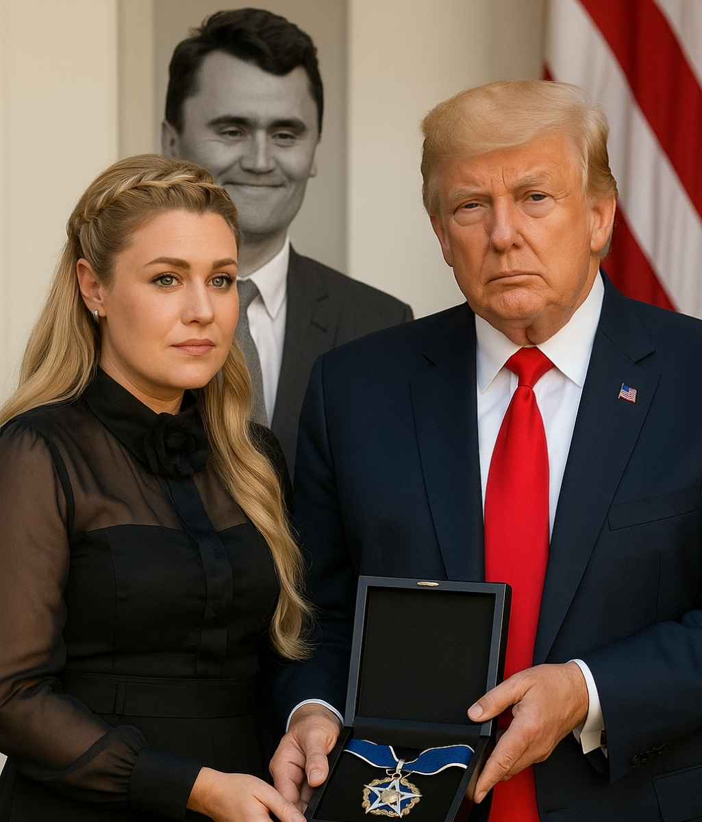 The room was hushed. Rows of veterans, lawmakers, and faith leaders stood shoulder to shoulder, yet the silence carried more power than any words could. At the center of it all stood Erika Kirk, Charlie’s widow, dressed in understated grace. When the President placed the medal in her trembling hands, she bowed her head — not in defeat, but in reverence. Her eyes glistened as though reflecting both the pain of loss and the light of legacy.