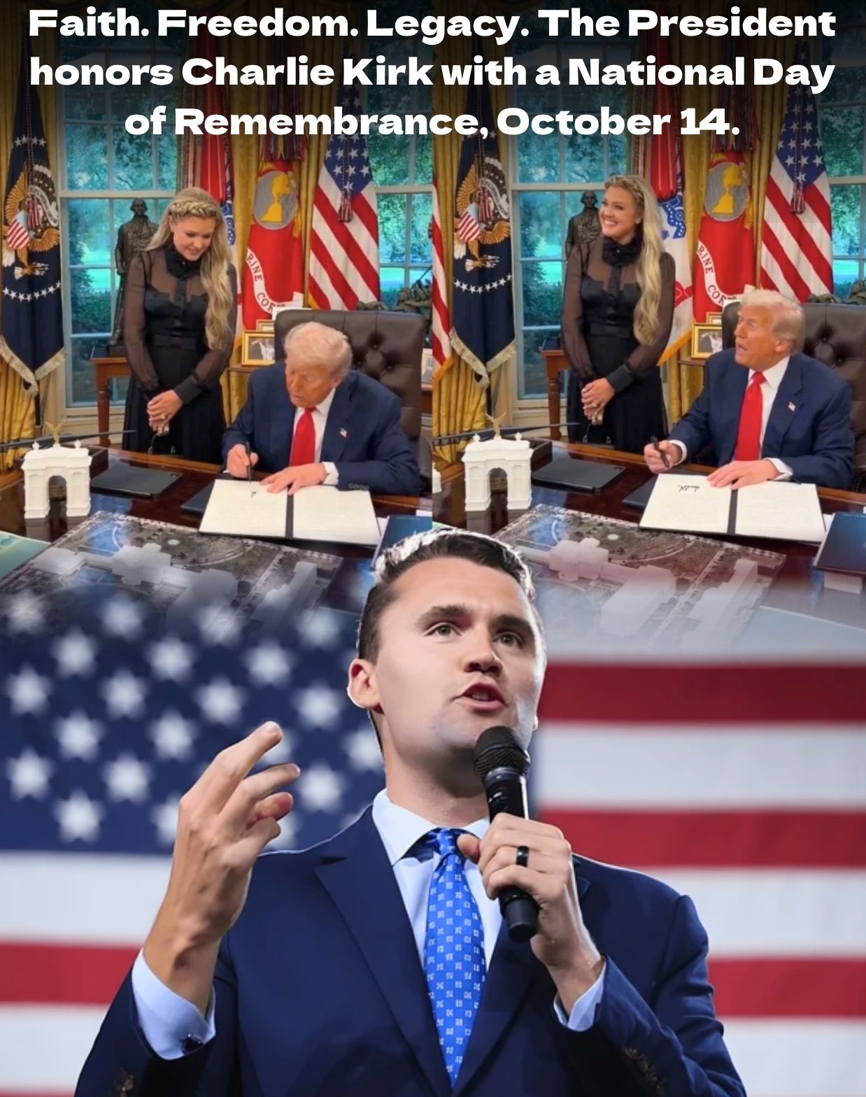 It was a scene filled with reverence and quiet emotion — the kind of moment that reminds a nation of what it means to remember. Inside the Oval Office, under the soft glow of afternoon light, the President of the United States stood solemnly beside Erika Kirk, widow of the late conservative leader Charlie Kirk, as he signed a historic proclamation declaring October 14 the National Day of Remembrance in Charlie’s honor.