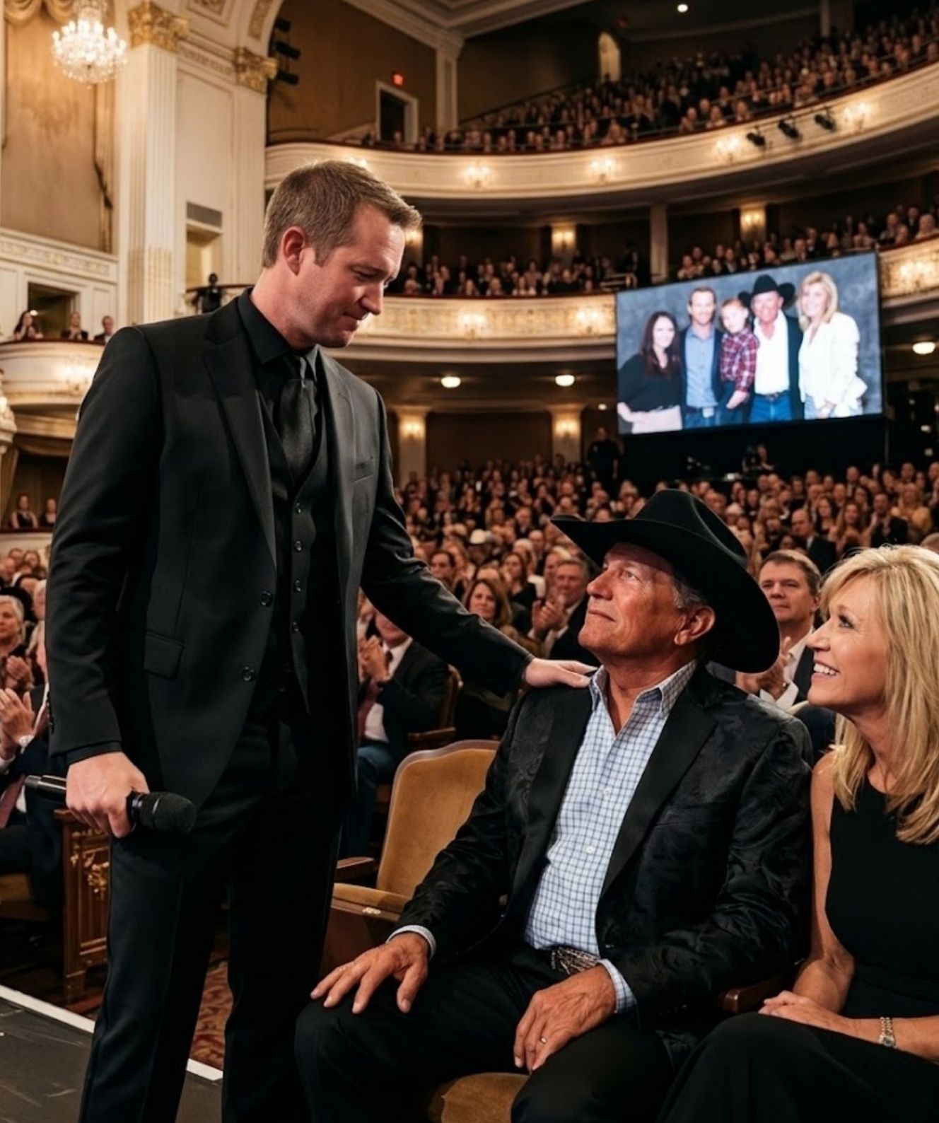 As George Strait Jr. continued, every note seemed to hold something more than music. It felt as though memory itself had taken shape in melody, moving through the room with a tenderness that was impossible to ignore. His voice did not need grandeur. It carried sincerity, and that sincerity was what made the moment unforgettable.