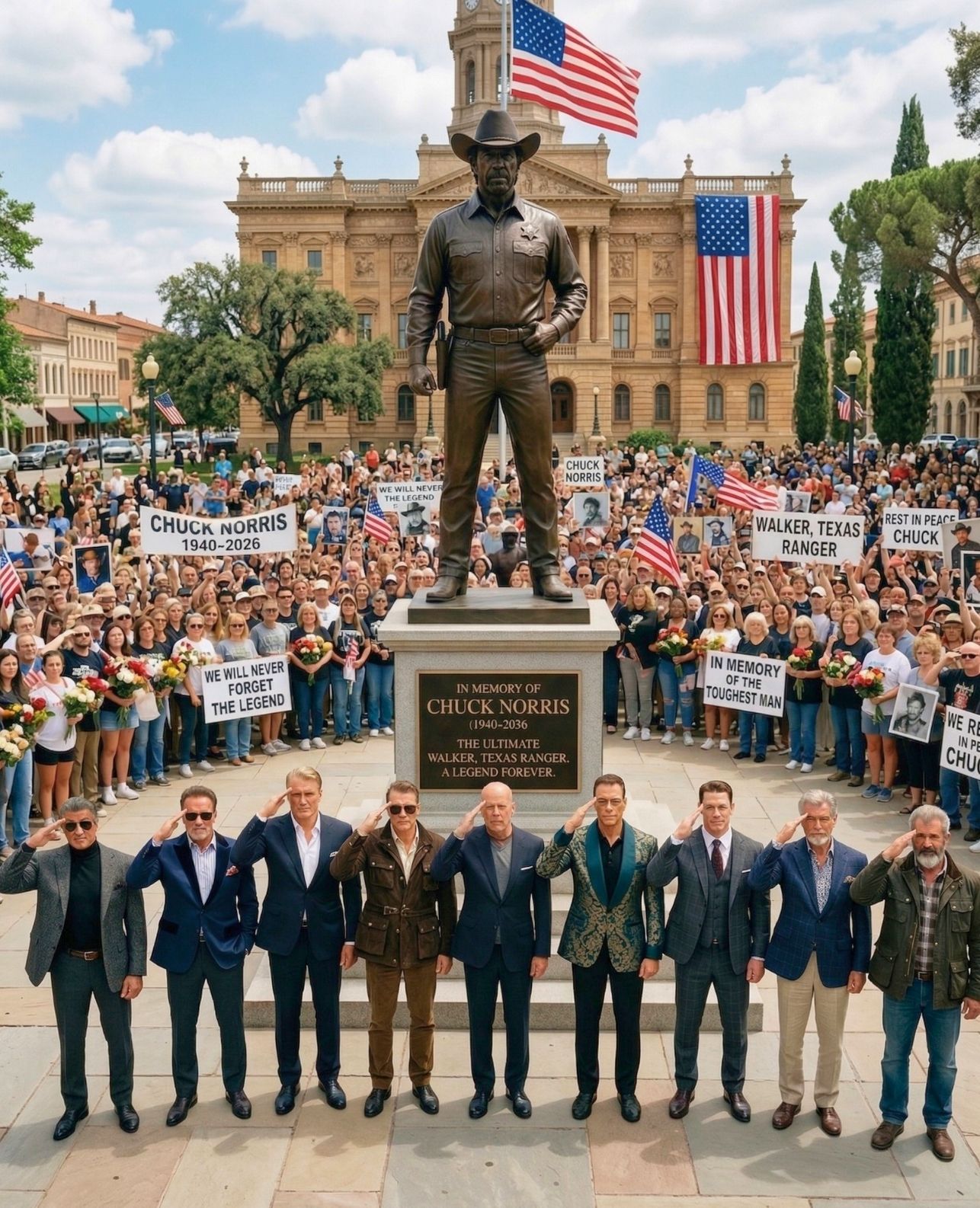 At the center of the ceremony stood a towering bronze tribute to Chuck Norris — broad-shouldered, unwavering, and cast in the unmistakable image that generations came to know and admire.