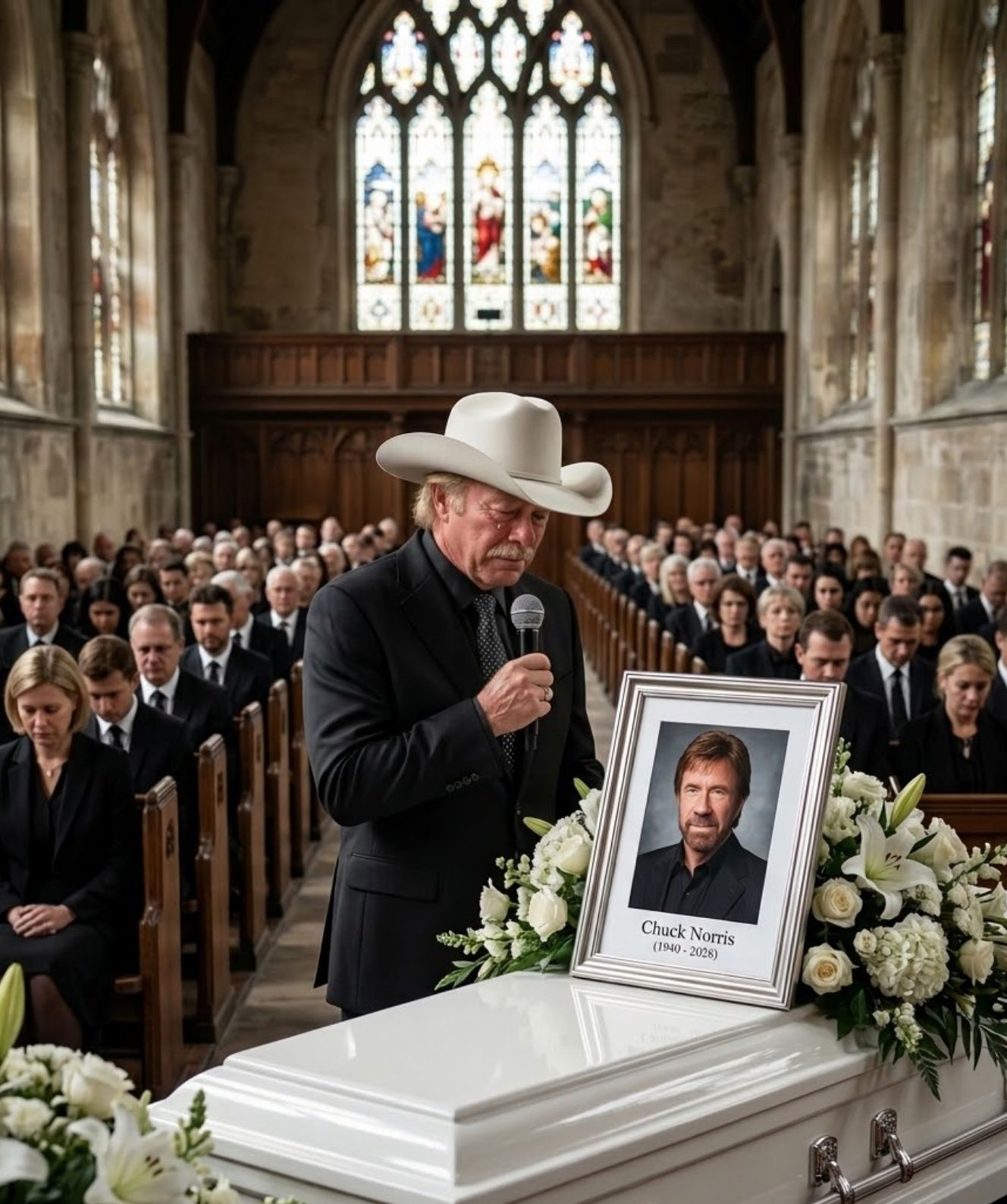 In a moment that no one saw coming, and one that will likely be remembered long after the final hymn faded into silence, Alan Jackson stepped forward at the memorial service of Chuck Norris, transforming an already somber gathering into something profoundly sacred. The loss of Chuck Norris, a man whose name had become synonymous with strength, discipline, and quiet resilience, had already cast a heavy shadow over the room. Yet what unfolded next turned grief into something deeper—something almost unbearably human.