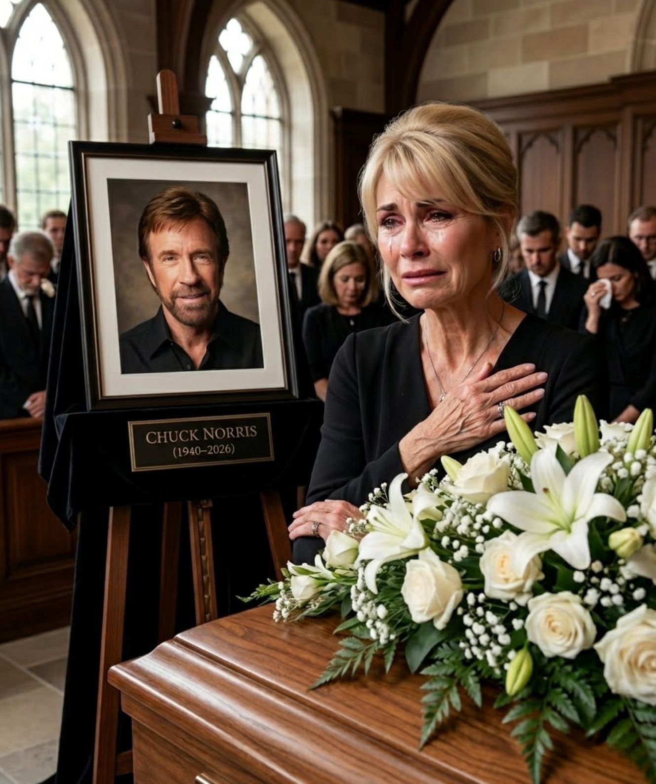 The atmosphere inside the memorial hall was already heavy with grief, shaped by the quiet understanding that the world had lost not just a public figure, but a man whose presence had left a lasting imprint on countless lives. Chuck Norris, known globally as a symbol of strength, discipline, and unwavering resolve, was being remembered with dignity, reverence, and deep respect. Yet no one in that room could have anticipated the moment that would soon unfold—a moment that would shift the tone of the entire farewell from solemn remembrance to something far more intimate and revealing.