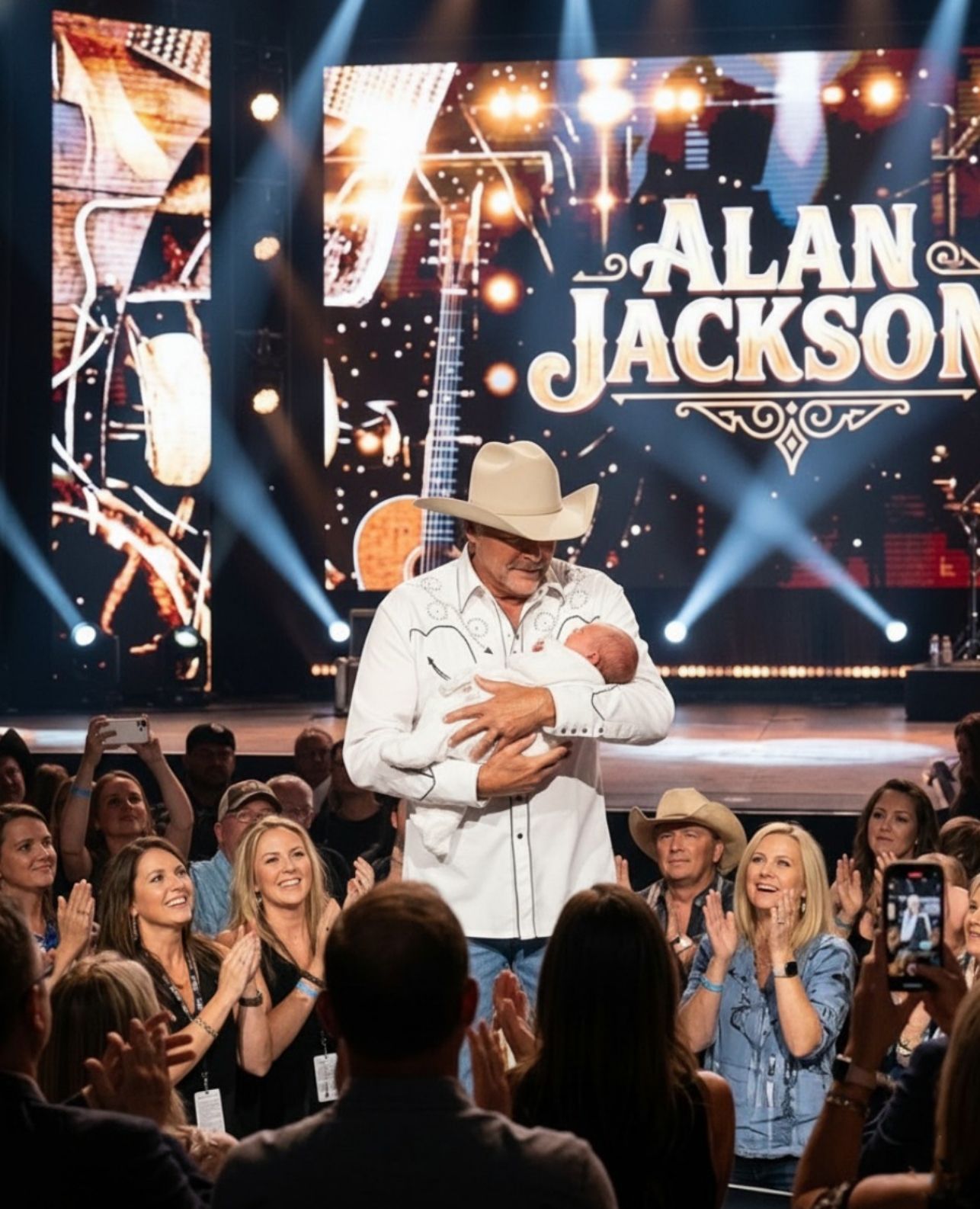 For older fans in the audience, many of whom have grown alongside Alan Jackson’s music, the moment likely stirred memories of their own — grandchildren, family traditions, names passed down through generations, and the quiet joy of seeing life begin again.