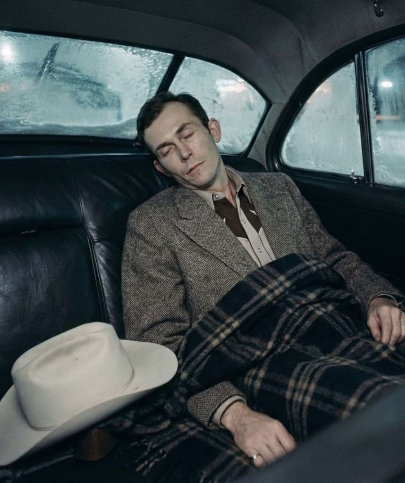 As the Cadillac pushed northward, mile after mile passed beneath icy tires. The countryside lay silent, locked in winter’s grip. Hank remained in the backseat, wrapped in coats, his presence growing quieter with each passing hour. Somewhere near Bristol, Carr offered him food. Hank softly refused.