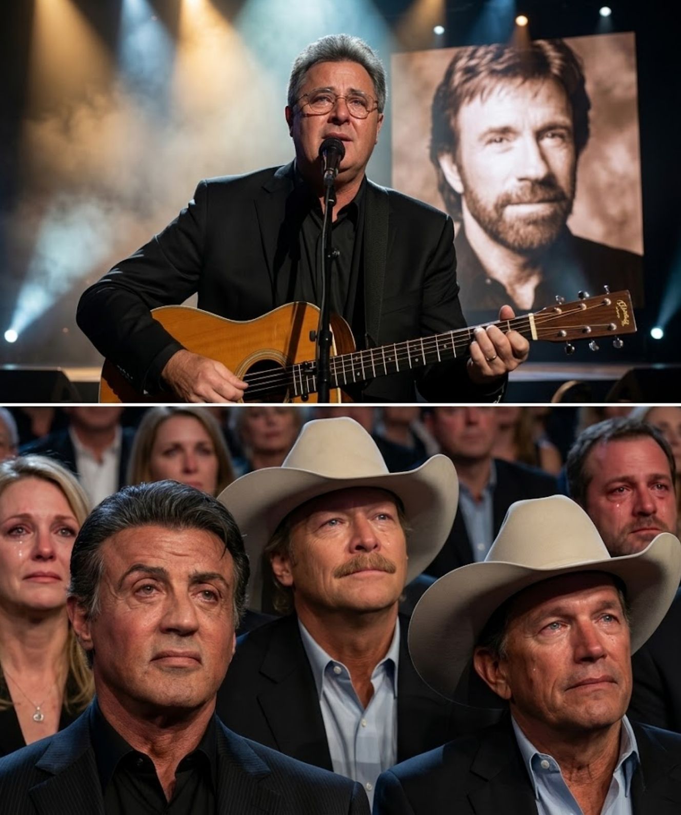 George Strait lowered his head, visibly shaken. Nearby, Sylvester Stallone — a man known for portraying some of cinema’s toughest figures — wiped away tears without hesitation. And at the center of it all, Chuck’s own family held onto one another, unable to hold back the emotion that filled the room.